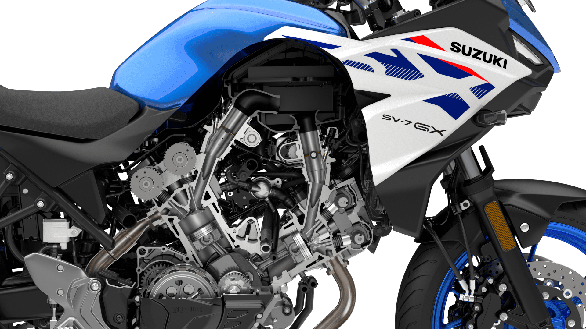 Voor de SV-7GX is de motor verder verfijnd en aangepast aan de eisen van een moderne crossover. Zonder afbreuk te doen aan de kenmerkende loop is het motorblok nu voorzien van slimme elektronische systemen en een Bi-directional Quick Shifter. Daarmee biedt het een toegankelijke rijervaring voor beginners én een plezierige, levendige respons voor de ervaren rijder.