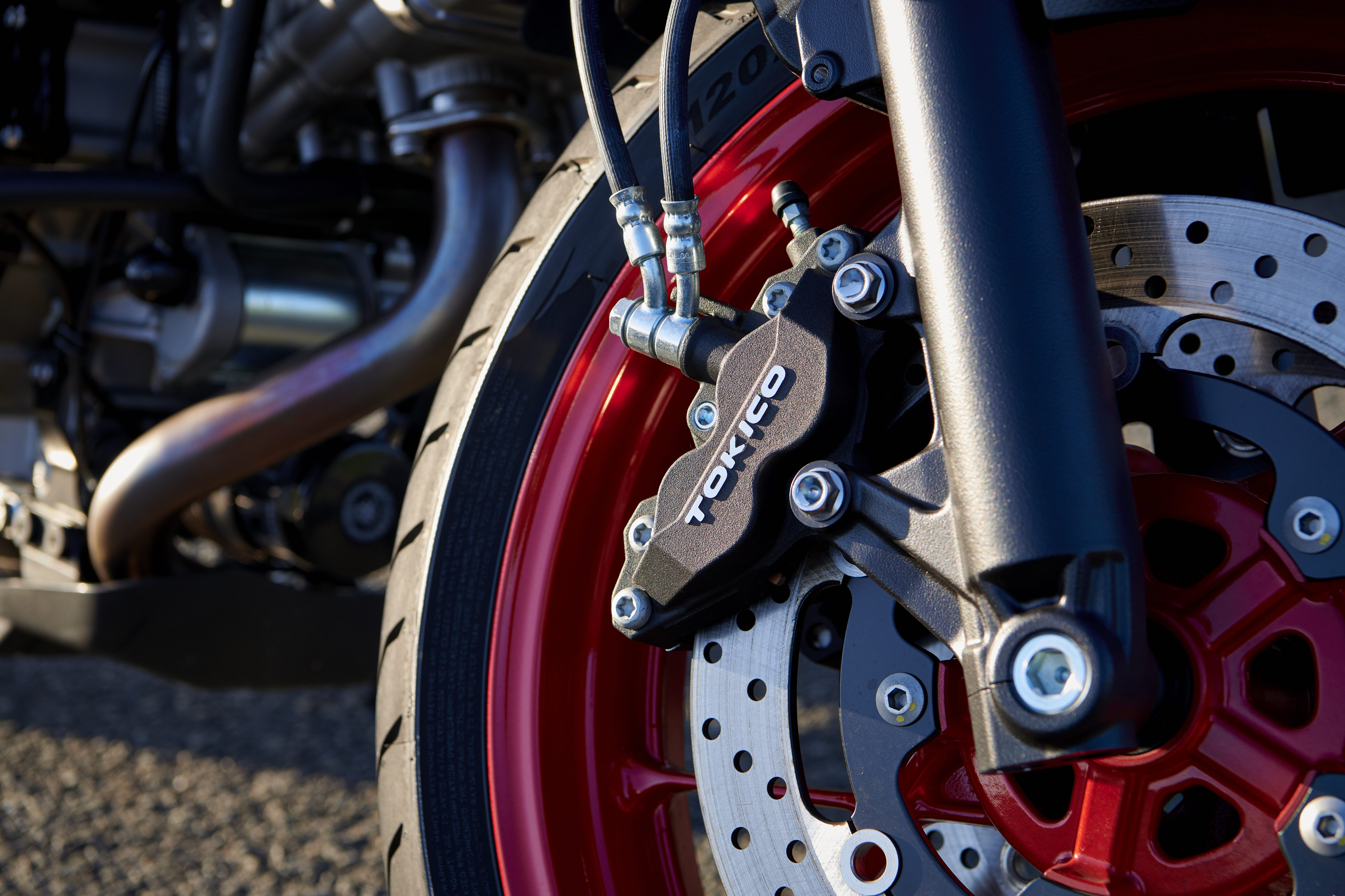 De gegoten aluminium wielen zijn van een aantrekkelijk nieuw tienspaaksdesign. Ze zijn gelakt in opvallende kleuren die de uitstraling van de motor versterken. De Triton Blue-versie heeft lichtblauwe wielen, de Pearl Matte Greige-versie contrasterend rode wielen.
